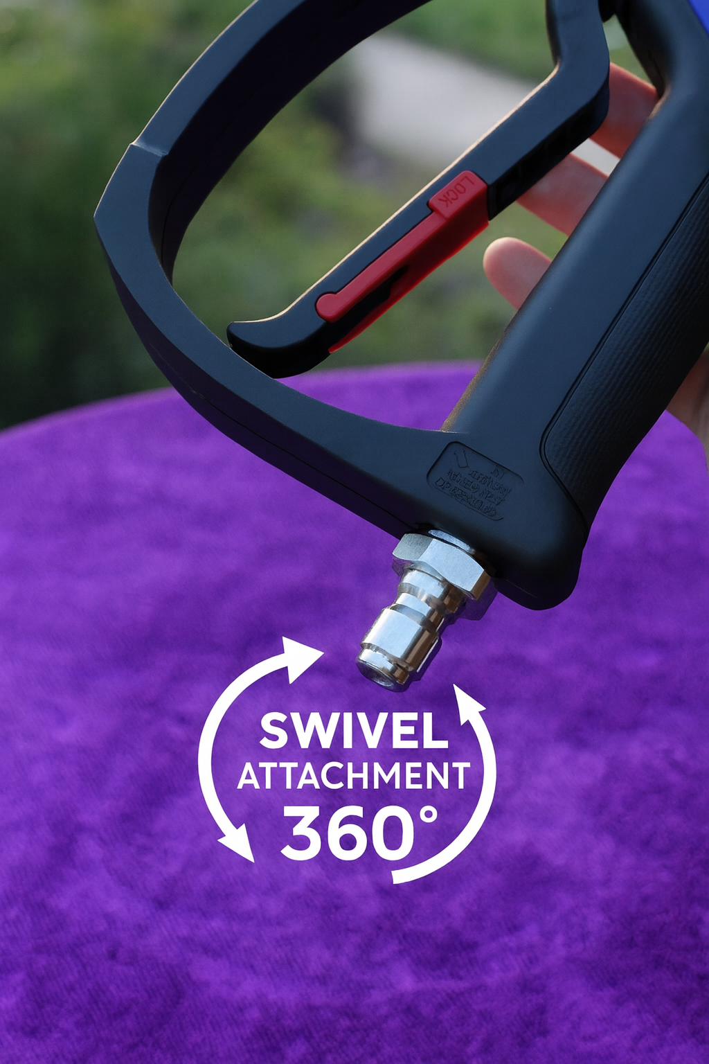 Say goodbye to bulky, stiff, awkward guns. This lightweight, short-body pressure gun is designed for control and balance. The built-in 360° swivel keeps your hose from kinking, while the quick-connect system makes swapping attachments effortless.